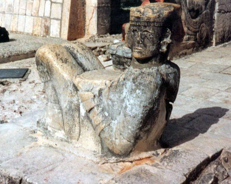 The Aztecs, the Itzá, and the Toltecs at Tula were familiar with the chac-mool, or "Red Hook," as an offertory receptacle. Most chac-mool figures have this position: the knees are bent upward, the back is flat against the ground and suddenly bends up at the chest. In his hands he holds a large bowl with a flat surface, on which sacrificial hearts were placed. With the chac-mool, the heart was believed sent directly to the gods. This chac-mool lies at the top of the Temple of the Warriors.