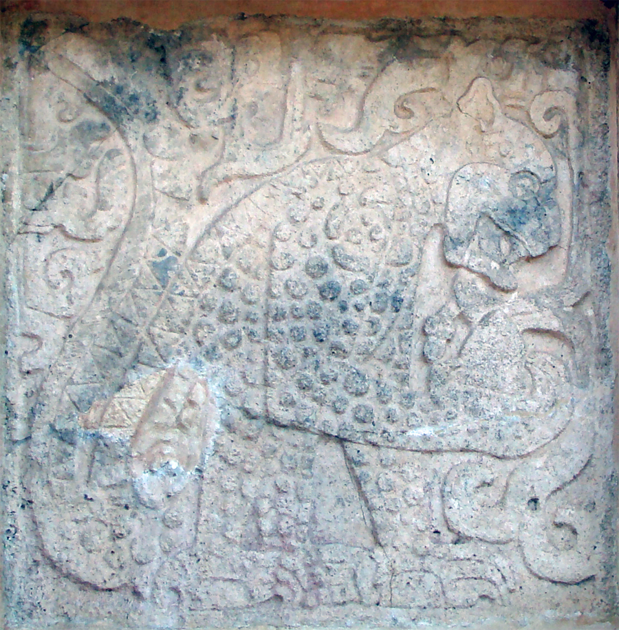 A powerful jaguar sits in relief portrait. Notice the rosettes upon the feline's skin, especially the one at the shoulder. It is speaking or singing, as suggested by the discourse flowing from its mouth and outward to form the rectangular cartouche framing the scene. The jaguar holds a sacrificial heart in its right paw.