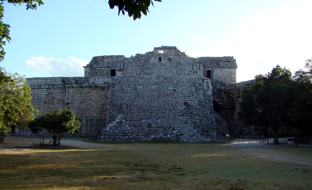 The Nunnery is a massive building south of El Caracol. Chaak heads, arched ceilings and Maya glyphs are abundant in this part of the city. The glyphs are highly suggestive of a new form of government in the north Yucatan called the mul tepal, or community rule. The Nunnery, or "Las Monjas," is a good candidate for a Council House where such joint rulers could assemble to discuss governance. Laden with repeating geometric elements, Puuc-style Chaak heads are pervasive in the building featured at right.
