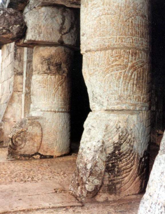 Each of the pillars in front of the temple has four sides, and on each side a distinctly dressed warrior stands in relief. The warriors are ornamented with garb that appears in depictions of both Toltec and Maya warriors although the warriors here are more representative of Maya military captains. The concept of warriors on pillar reliefs also appears at Tula. To the right of the temple is a huge colonnade, shown at the far right here, that earlier supported a temple roof.