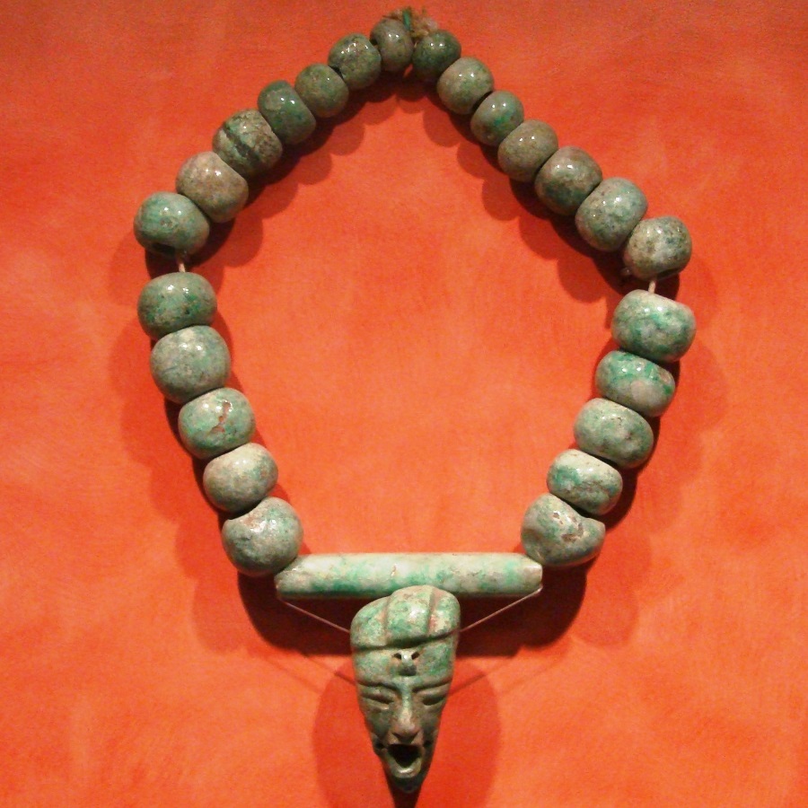 And now for some color. Both of these Izapa figures have faces with mouths agape. The greenstone necklace bears a small pendant with a slender human face. Izapa is an important site for the early history of Maya art for not only its sculpture symbolism but also its pottery, which was part of an explosion of new styles coming from the Chiapas coast at the turn of the Classic period. The vase's mouth seems extended, like the mask of the Wind God Ehecatl, and the ears hold spools, typical of nobility.