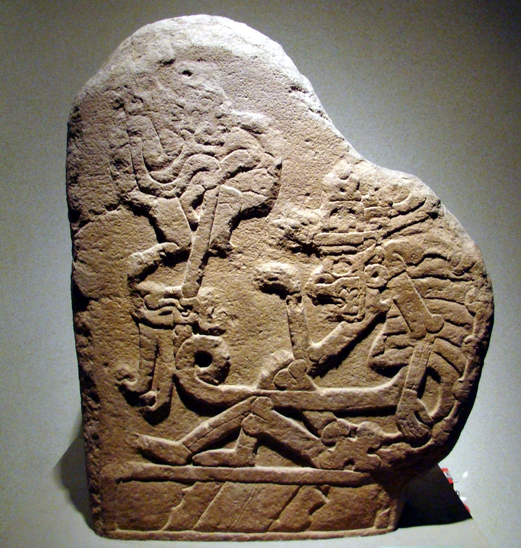 In this stele the sky is depicted above with outward-curling fangs. The principal figure, in the foreground, has decapitated a victim, probably a human sacrifice. The standing figure is holding the blade in his extended hand, and he holds the severed head in the other. In the background two men are carrying a litter with what appears to be a man inside. Atop the litter is a jaguar, either emblematic or slain, but in either case associated with political power.