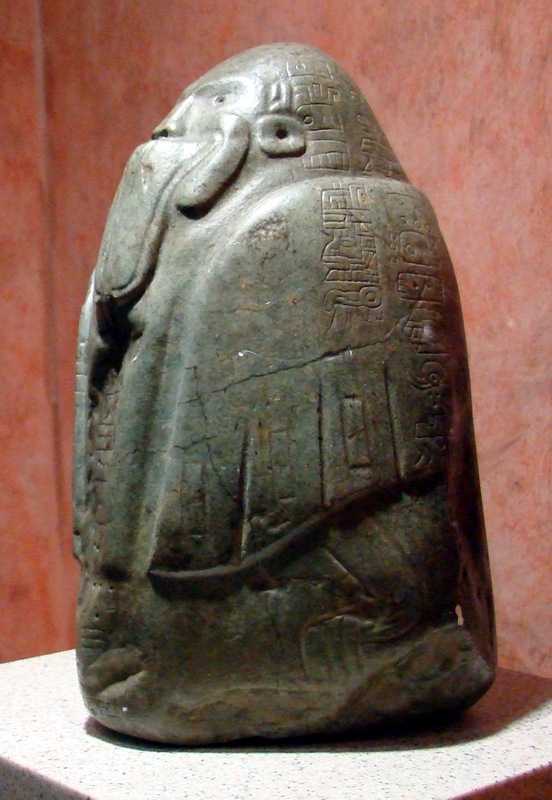 The Epi-Olmec period marks the shift of central power from the declining Olmec societies to emerging political centers, notably in central Mexico, southern Mexico, and the Maya region. Even as the Olmec civilization was waning, the culture of Mesoamerica's "Mother civilization" profoundly influenced artistic, political, religious, and other aspects of later societies. One of these major Olmec contributions was the development of a writing system, a unique invention in the pre-Columbian New World, that the Maya and other societies would adopt and transform toward their own languages. This small sculpture from the Tuxtlas mountain region of southern Veracruz features a human wearing the mask of a boat-billed heron, according to John Justeson and Terrence Kaufman. Its numerical date has been correlated to 162 AD, and one interpretation of its script indicates that a ruler, probably the masked figure here, assumed power from his animal double. Details of the script are visible on both the front and side views.