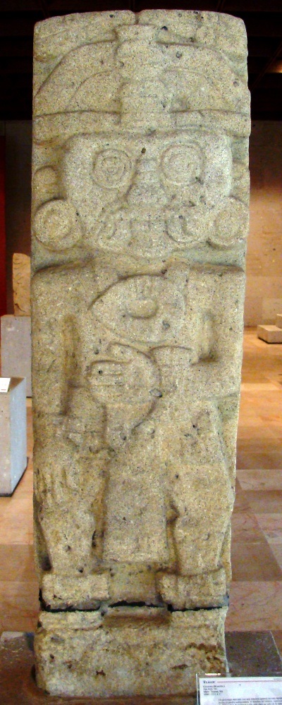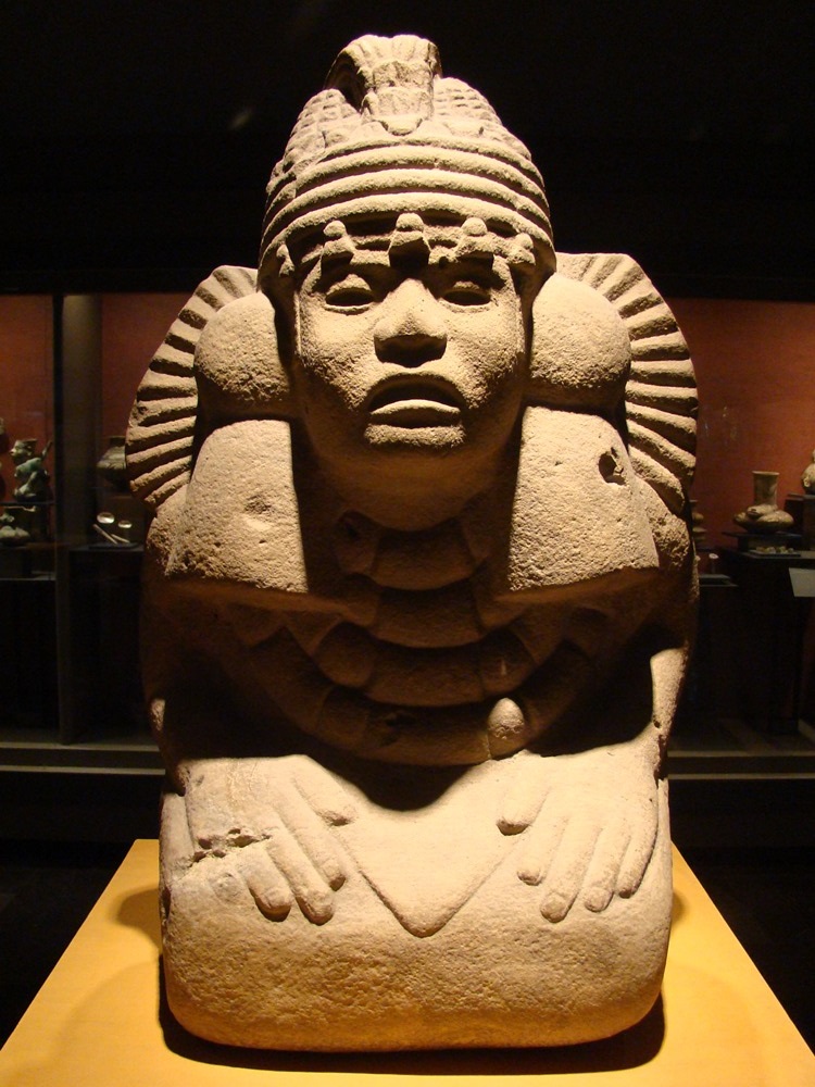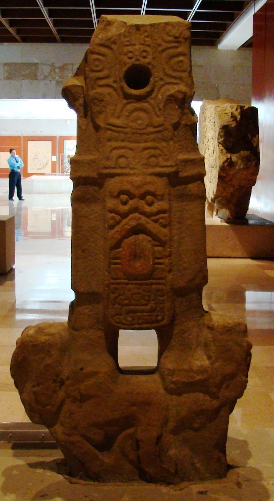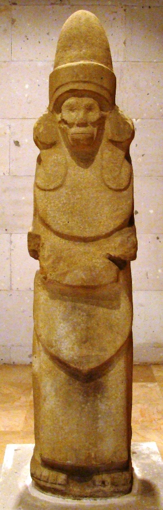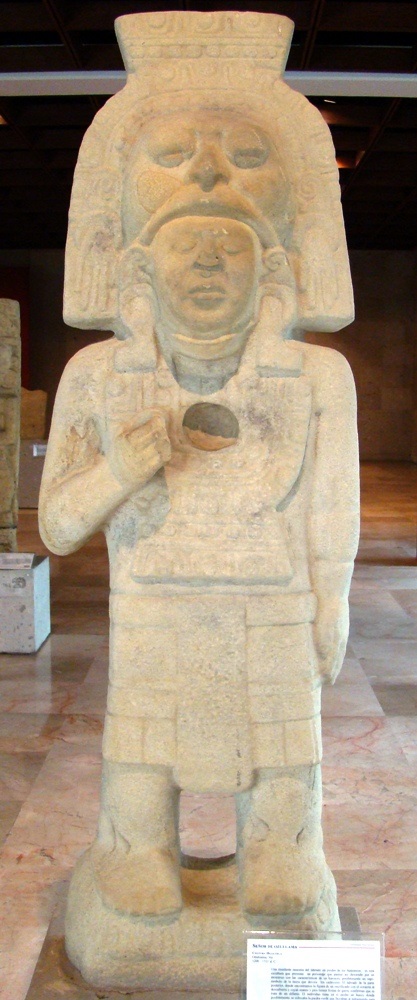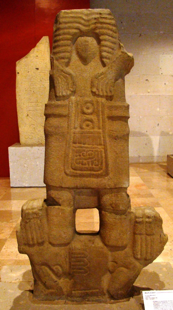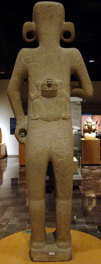 Standing at nearly two-thirds life-size, the Lord of Ozuluama is an intriguing expression of Huaxtec concepts of death. On the front side, as pictured here, the upper jaw of a great monster appears to be devouring the deceased lord by starting on the top of the head. On the back of the figure is a small relief of a skeleton, probably a death deity, with taloned hands and feet.
