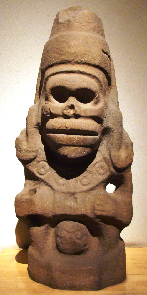 These mysterious figures have accessories characteristic to the Gulf Coast, most notably the conical headdress and hook-shaped earrings, all exaggerated here. Other well-known deities like the Wind God Quetzalcoatl-Ehecatl still retain such Gulf Coast elements, even where the deity is represented in other parts of Mesoamerica. These death deities seem to have monkey skeletal faces. Both sculptures are from Chicontepec, Veracruz.