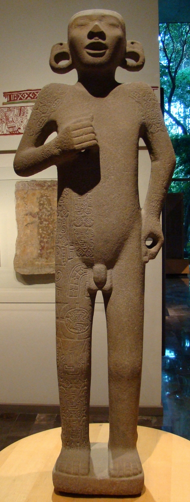The famous "Adolescent" sandstone sculpture represents a priest. Aside from the reverent posture the youth shows, this sculpture is unique in the detail of the tattoos on most of the young man's back, from his nape to his heels. The detailed symbols are associated with the Huaxtec Quetzalcoatl. The Adolescent is from the site of Tamuín, San Luis Potosí.