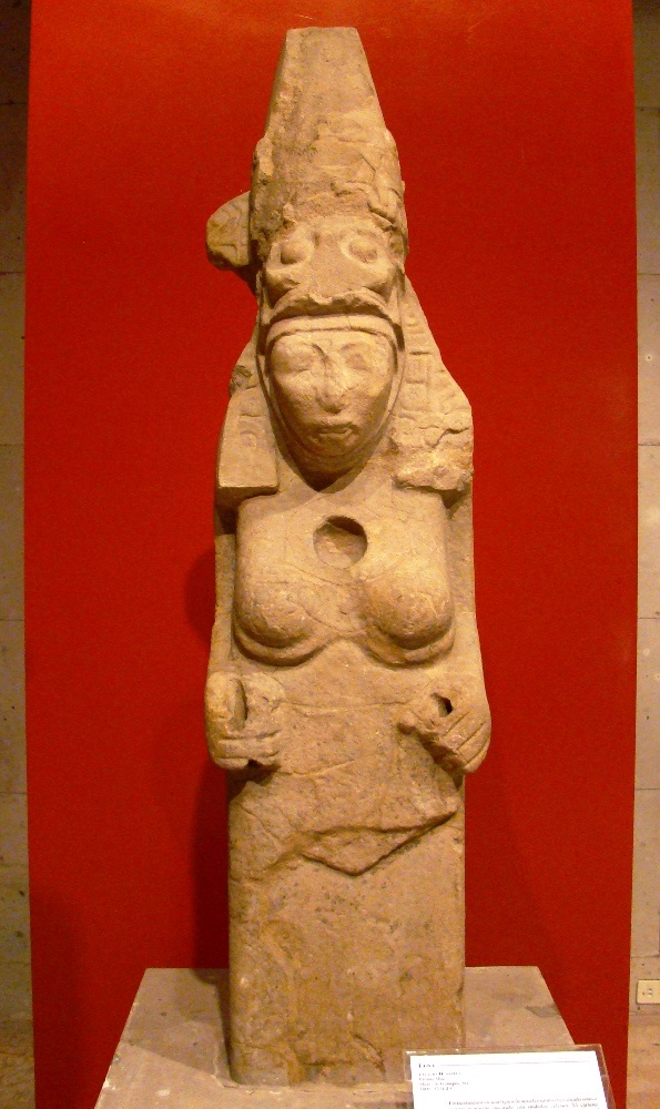 "Moon" and "Sun" are here placed in quotation marks for sake of convention, not to suggest that these sculptures have a direct correlation to those celestial bodies. The two sculptures are from Las Palmas, Veracruz. They may have originally stood as doorjamb supporters. Both of these figures have the familiar conical headdress of the Huaxtec priesthood, and their headdresses are both stylized as the open jaws of a large beast.