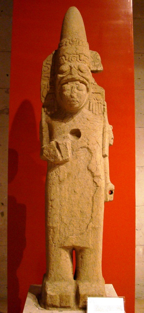 I really like this one. Here the top of the goddess's headdress holds three ears of corn; this maize headdress is the most common symbol for corn deities in Mesoamerica. Because maize was so essential to subsistence in Mesoamerica, such agricultural deities were and continue to be central to community cult. The maize deities could be represented as female, such as with this splendid sculpture, or as male, as with the boyish Dhipaak. In contemporary indigenous religion of northern Veracruz, the maize is personified in both male and female aspects, often as either a boy and girl among the contemporary Nahua or as a grandmother and grandfather as among the neighboring Otomí peoples.
