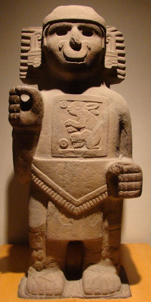 One of several intoxication deities. Ometochtli literally means "Two Rabbit" - on his chest he bears the emblem of a rabbit's face with two dots, signifying the day-sign of his birth. An Aztec myth says that he was eventually killed by Tezcatlipoca. The clasping positions of his hands suggest that this statue may have supported banners for the Huaxtecs.