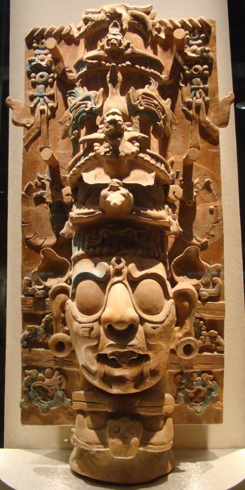 These tall polychrome "chimney" censers are unique to the Palenque region of central Chiapas, and each is distinctly decorated with a rich ensemble of zoomorphic and plant symbols. Each censer has a rounded front, headed by a male face bearing an animal headdress. See what differences you can find among the five pictured in the large picture at left. The leftmost of these censers is detailed in the image at right, in which you can see elements of catfish, crocodile, turkey, and other animals upon the chimney. Many of these were made under the reign of Kan B'alam II, "Serpent Jaguar," in the late 7th century.