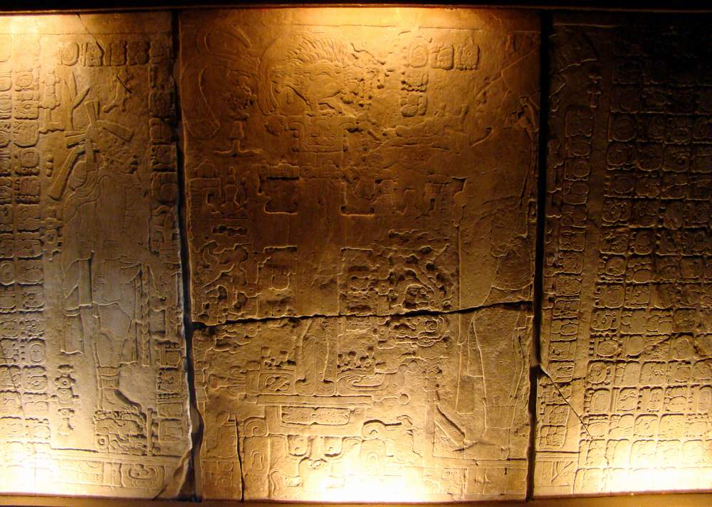The lid of the Pakal sarcophagus features a youthful version of the king as he "entered the road" into the jaws of the Underworld of the White Bones House, at the foot of the First Tree. The sides of the rectangular sarcophagus feature reliefs of ten royal ancestors in Pakal's lineage, each identified by a distinct animal and tree headdress. The king in the detail at right is Kan B'alam I, who ruled from 572 to 583. These images are from a full reproduction of the tomb at the National Museum of Anthropology.
